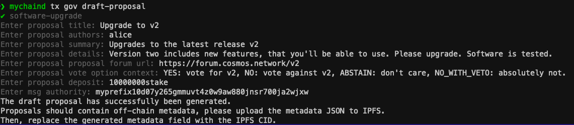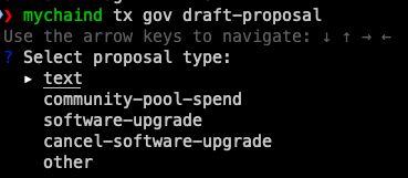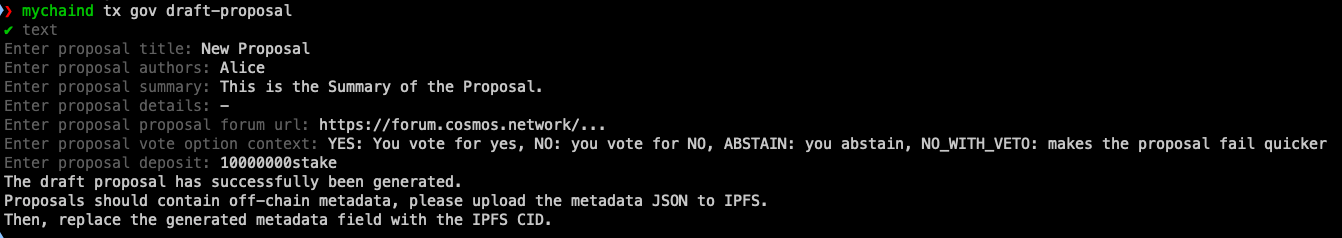 To create a simple text proposal, use the following command:mychaind tx gov draft-proposal
